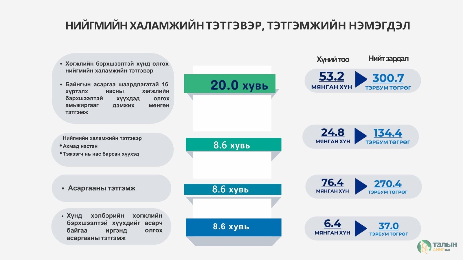 Энэ сарын 1-нээс эхлэн Нийгмийн халамжийн сангаас олгож байгаа Хөгжлийн бэрхшээлтэй иргэн болон хөгжлийн бэрхшээлтэй хүүхдийн тэтгэвэр, тэтгэмжийн хэмжээг 20 хувиар нэмэгдүүлж, 478.0 мянган төгрөг, бусад төрлийн нийгмийн халамжийн тэтгэвэр, тэтгэмжийн хэмжээг 8.6 хувиар нэмэгдүүл шийдвэр хэрэгжиж эхэллээ.